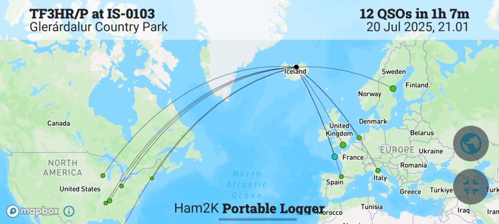 I operated mostly on 20m around 14.061MHz but managed one contact at the end of my activation on 30m. My activation started at 21:00UTC (Iceland is on UTC time so thats local time as well). I was able to get 12 total contacts making this a valid activation! Most of my contacts were early on in the activation, within the first 30 minutes. Things then got more quiet. I packed up after about 1h30minutes.